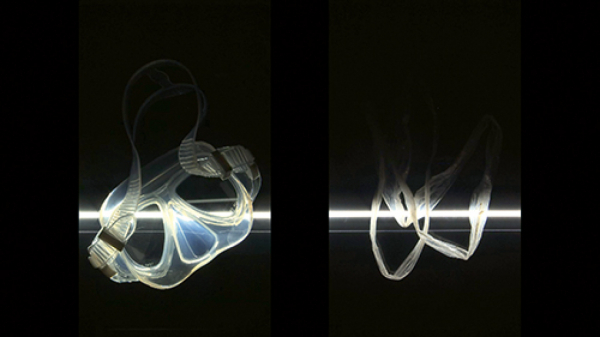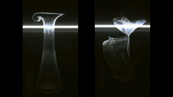 Was wir in Lanz' Videos im Licht der beiden gleich schnell von unten nach oben fahrenden Scannereinheiten sehen: Mehr oder weniger transparente Objekte und Materialien erscheinen gerade so lange, dass man teils naheliegende, teils überraschende formale Übereinstimmungen erkennn kann. Ob Küchen- oder Laborgeräte, Dinge aus dem Alltag oder aus dem Abfall: Für eine kurze Zeitspanne aus der Dunkelheit an Licht geholt, entfalten diese Materialien einen ganz eigenen Zauber.