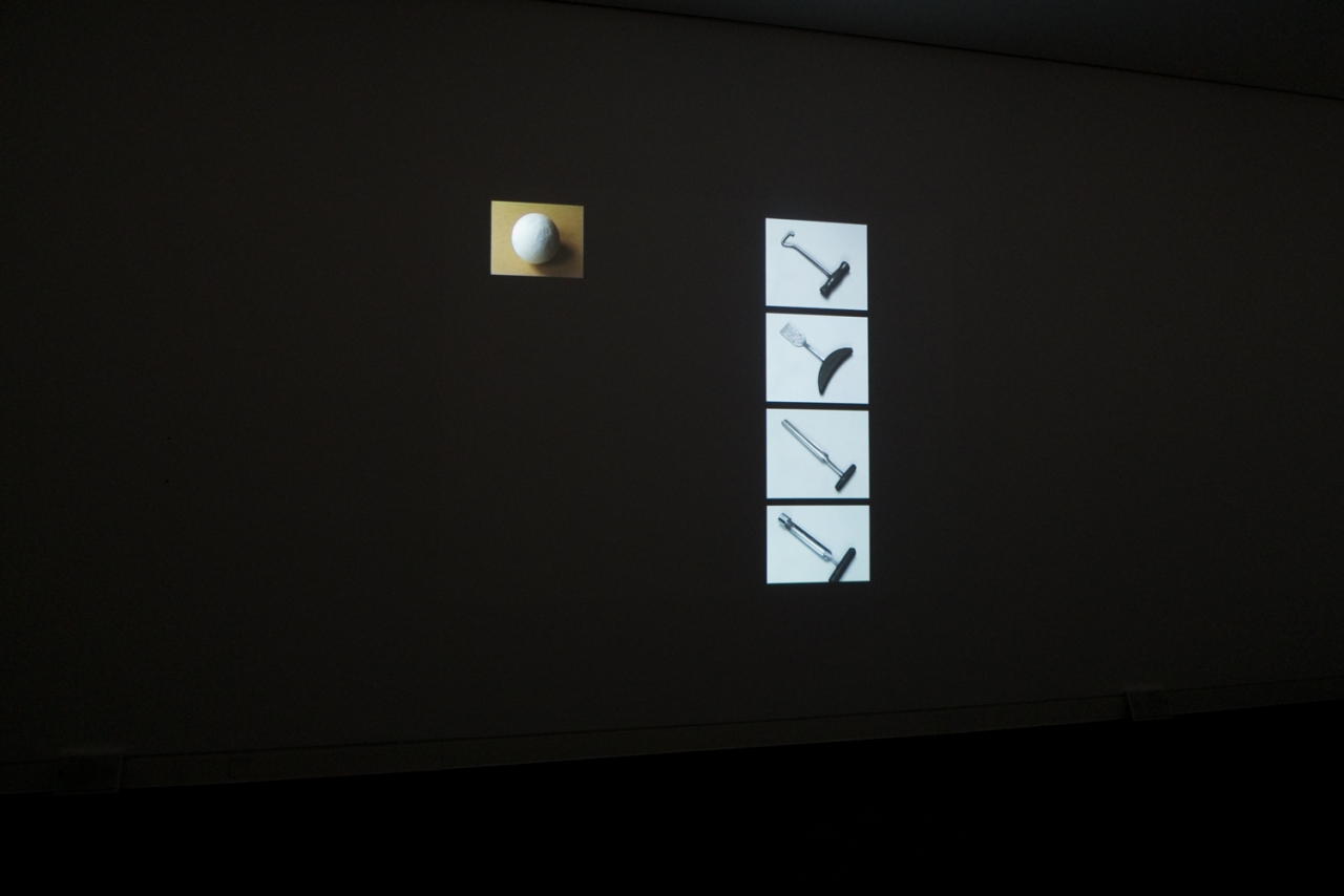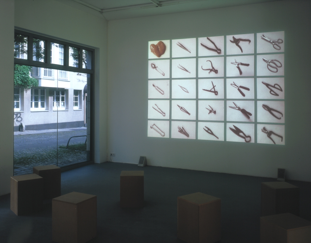 Cette installation encyclopédique prend pour thème l’évolution par laquelle l’homme met au point des outils pour domestiquer son environnement. Donnant un tour d’écrou supplémentaire à la réflexion, Eric Lanz construit son installation comme un logiciel interactif. Sur l’écran de projection apparaissent donc divers objets, substances et matières qu’un utilisateur invisible manipule virtuellement en se servant parmi les palettes d’outils. Le curseur déroule les menus, clique sur les cases choisies et donne lieu aux actions. Mais l’interactivité est seulement figurée : le spectateur ne fait que regarder. En plus, toute sa « culture d’interface » usuelle est mise à mal par une torsion quasi systématique des habitudes: l’usage des outils est totalement libéré du respect de leur destination première. Le spectateur, lui, reste passif et fasciné. Au final, avec ce vertige d’actions arbitraires et infinies, la variété et la richesse du donné actuel renvoie brusquement les promesses de l’ingénierie virtuelle à ses pauvres illusions génériques.